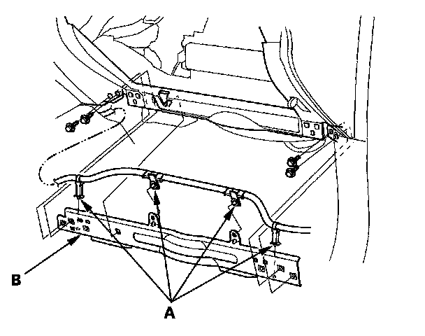 2. Remove the harness clips (A), the bolts, and the glove box frame (B).