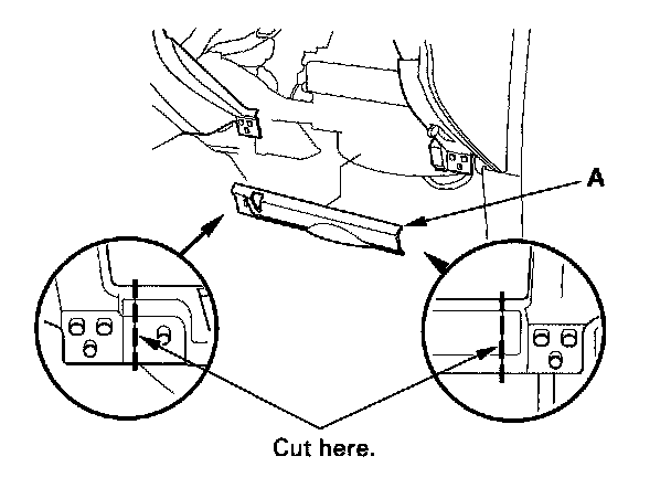 3. Cut the plastic cross brace (A) in the glove box opening with diagonal cutters in the area shown, and discard it.