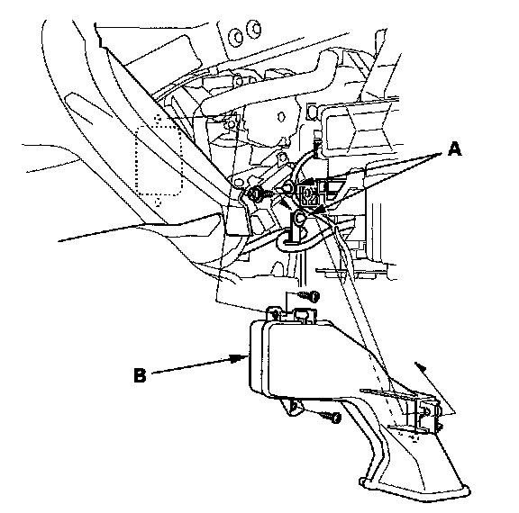 4. Remove the wire harness clips (A), the self-tapping screws, and the passenger's heater duct (B).