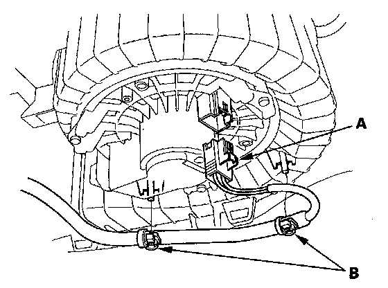 5. Disconnect the connector (A) from the front blower motor. Remove the wire harness clips (B).