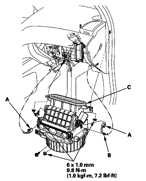 6. Disconnect the connectors (A) from the recirculation control motor and adaptive front lighting control unit, then remove the harness clip (B). Remove the self-tapping screws, the mounting nuts, and the blower unit (C).