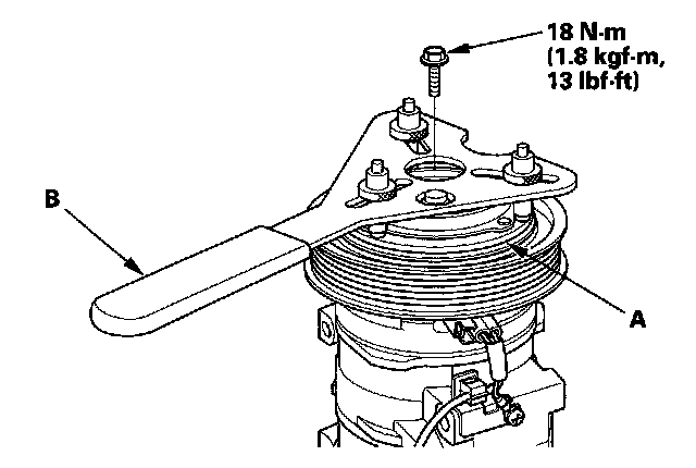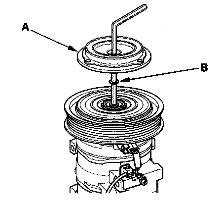 1. Remove the center bolt while holding the pressure plate (A) with a commercially available A/C clutch holder (B).
