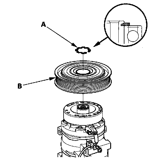 3. If you are replacing the field coil, remove the snap ring (A) with snap ring pliers, then remove the pulley (B). Be careful not to damage the pulley or the A/C compressor.