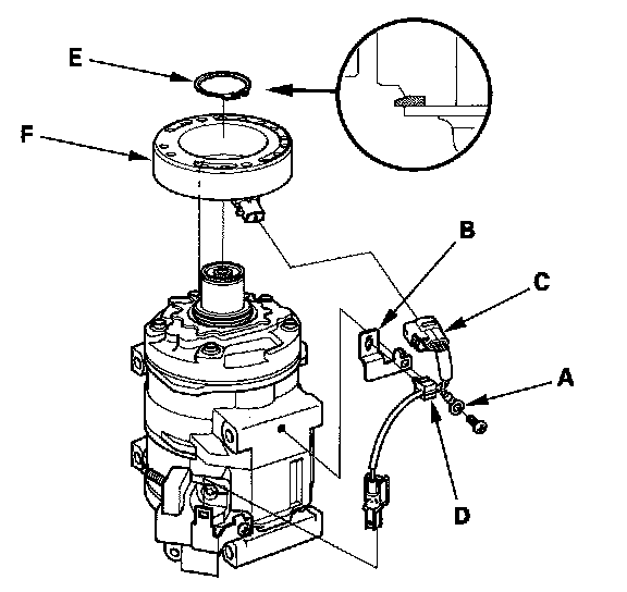 4. Remove the screw from the field coil ground terminal (A) and bracket (B). Disconnect the connector (C) from the field coil, then remove the wire harness clip (D). Remove the snap ring (E) with snap ring pliers, then remove the field coil (F). Be careful not to damage the field coil or the A/C compressor.