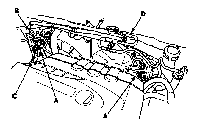 6. Disconnect the fan motor connectors (A), harness clamp (B), engine coolant temperature (ECT) sensor 2 subharness connector (C) and coolant reservoir hose (D).