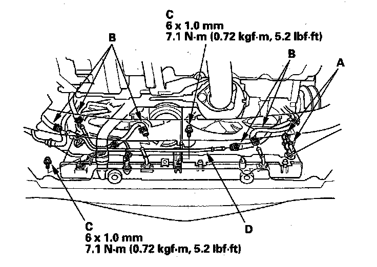 10. Remove the ATF cooler pipe mount bolts (C), then remove the ATF cooler pipe (D).