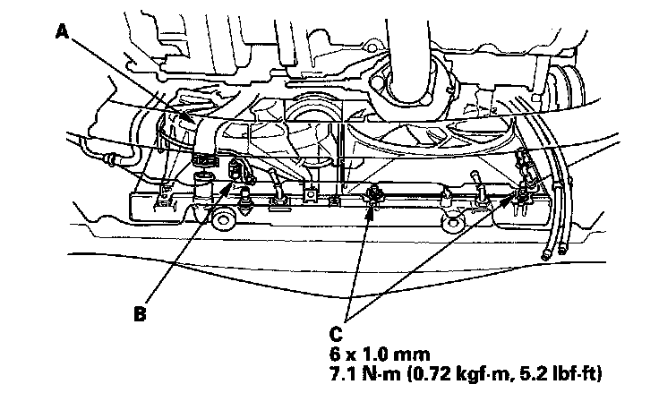 11. Remove the lower radiator hose (A) and disconnect the ECT sensor 2 connector (B) and loosen the two bolts (C).