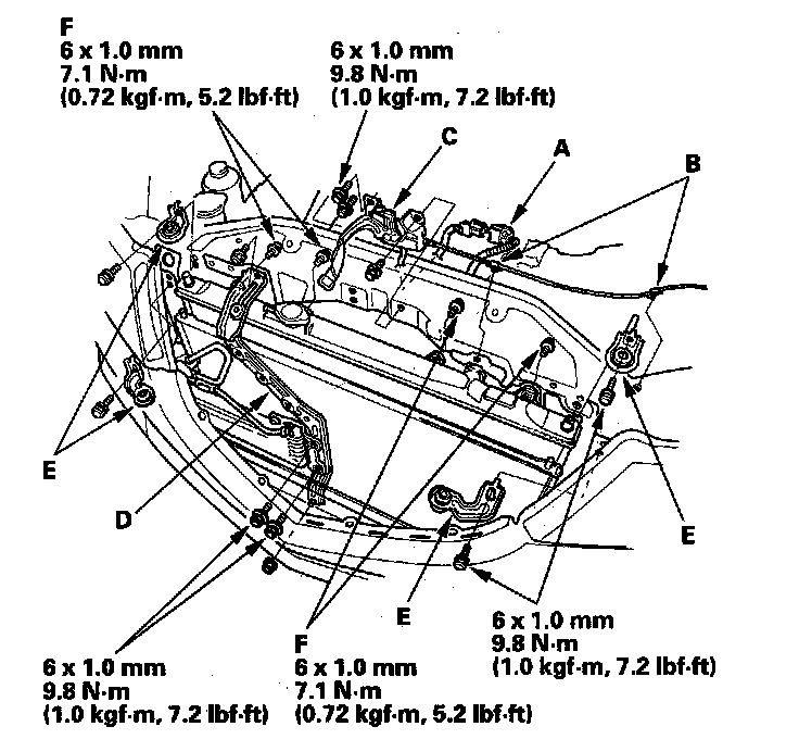 13. Remove the bulkhead bracket (D), and radiator and A/C condenser mount upper bracket/cushion (E), then remove the fan shroud mount bolts (F).