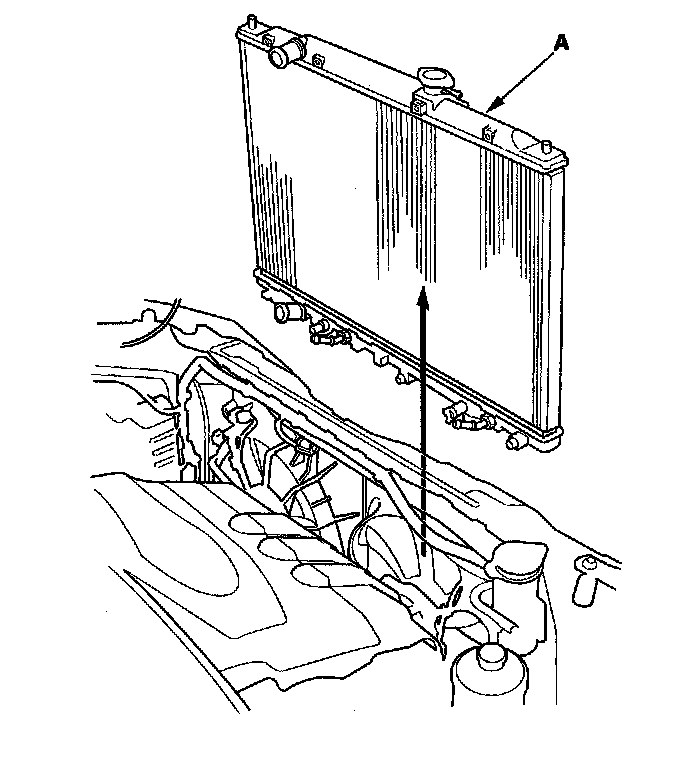 14. Move the fan shroud assemblies toward the engine, then pull up the radiator assembly (A).