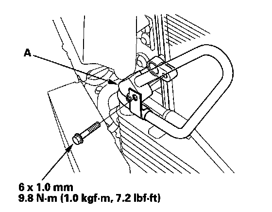 3. Remove the bolt, then disconnect the discharge hose (A) from the A/C condenser.