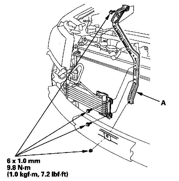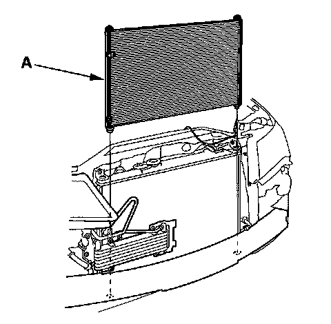 8. Remove the A/C condenser (A) by lifting it up. Be careful not to damage the radiator and A/C condenser fins when removing the A/C condenser.