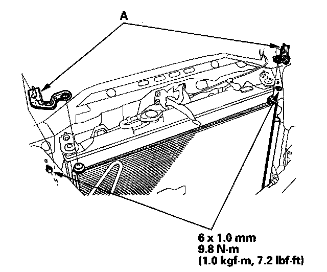 6. Loosen the bolts, then remove the A/C condenser upper mount brackets (A).