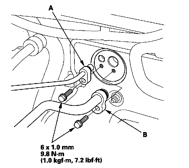 3. Remove the bolts, then disconnect the front receiver line (A) and the front suction line (B) from the front evaporator core.
