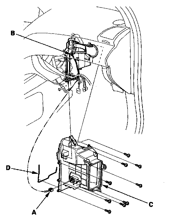 5. Disconnect the connector (A) from the front power transistor, then remove the harness clip (B). Remove the self-tapping screws, the expansion valve cover (C), and the seal (D).
