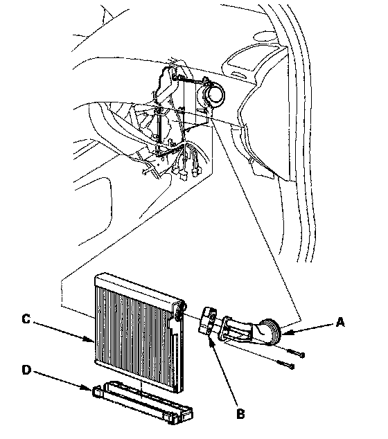 6. Remove the bolts, the inlet and outlet pipes (A), and expansion valve (B). Carefully pull out the front evaporator core (C), then remove the plate (D).