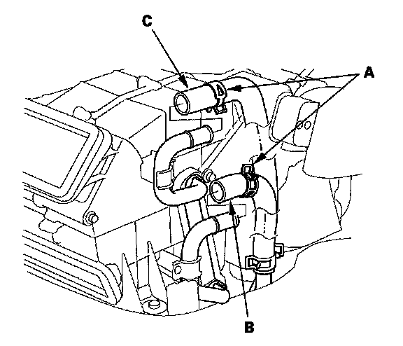 3. Slide the hose clamps (A) back, then disconnect the rear inlet heater hose (B) and the rear outlet heater hose (C) from the rear heater core. Note the orientation of the hose.