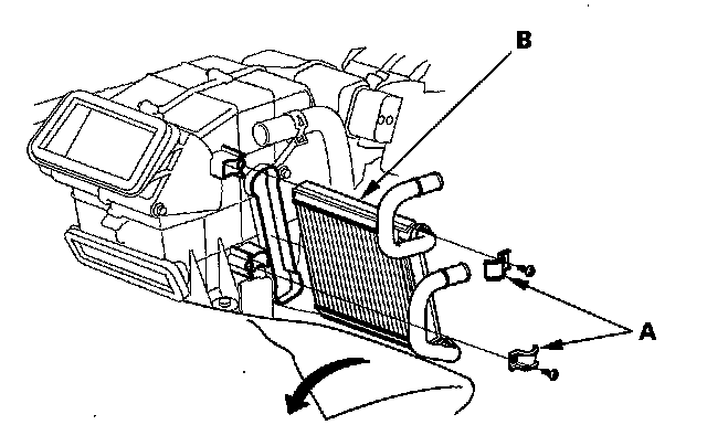 4. Turn over the carpet. Remove the self-tapping screws and the clamps (A). Carefully pull out the rear heater core (B) without bending lines.