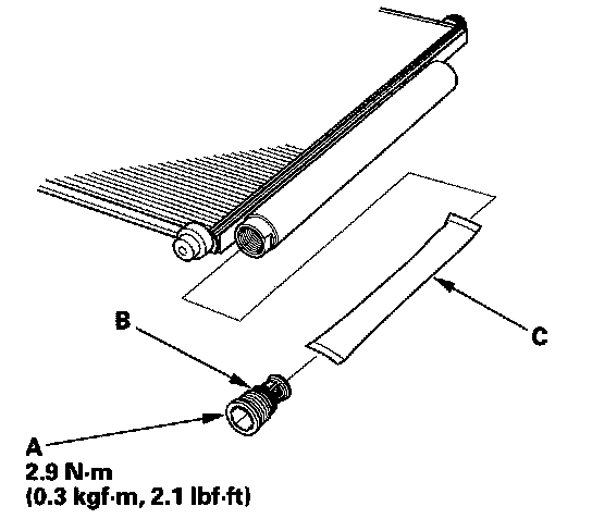 2. Remove the cap (A) from the bottom of the A/C condenser. Remove the O-ring (B) and the desiccant (C).