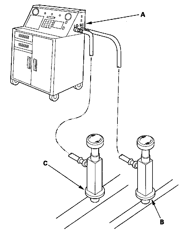 1. Connect an R-134a refrigerant recovery/recycling/charging station (A) to the high-pressure service port (B) and the low-pressure service port (C), as shown, following the equipment manufacturer's instructions.