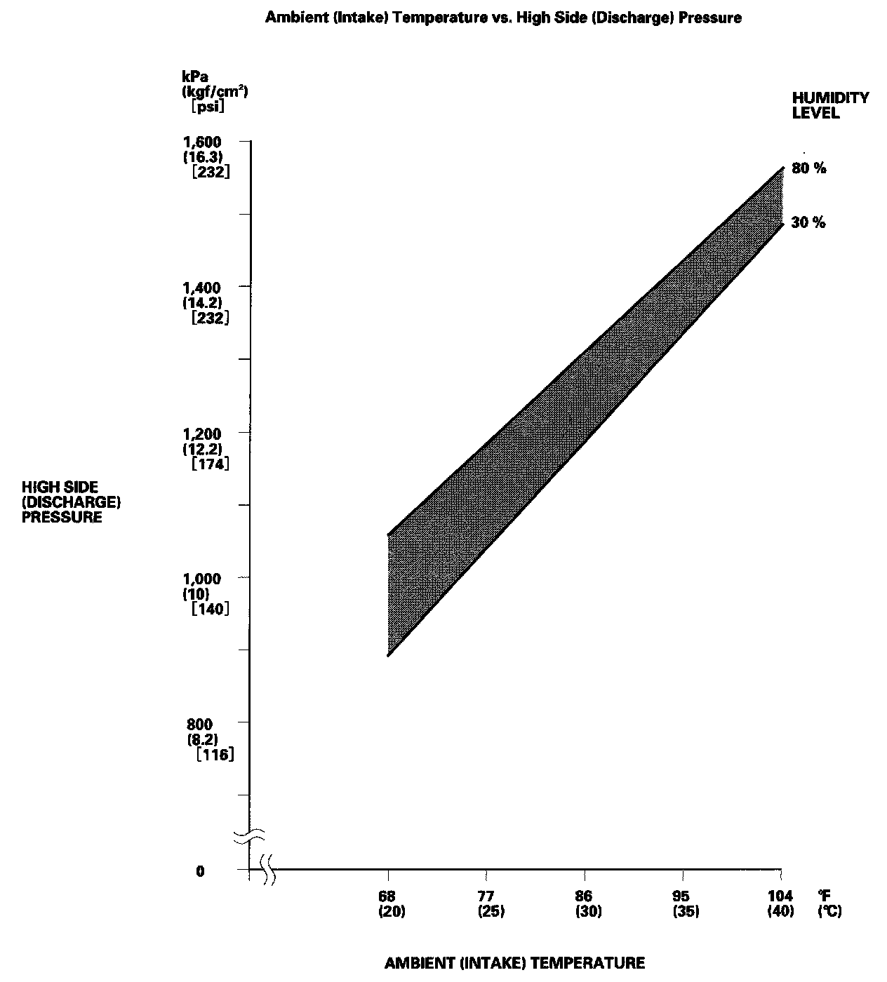 7. After running the air conditioning for 10 minutes under the above test conditions, read the delivery temperature from the thermometer in the center vent, the intake temperature near the blower unit, and the discharge (high) and suction (low) pressures on the A/C gauges.