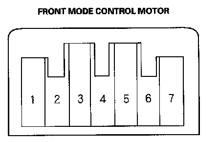 4. Use a digital multimeter with an output of 1 mA or less at the 20 kohms range. With the front mode control motor running as in step 2, check for continuity between the No. 3, 4, 5, and 6 terminals and the No. 7 terminal individually. There should be continuity for a moment at each terminal as the motor moves past the switch's terminal.