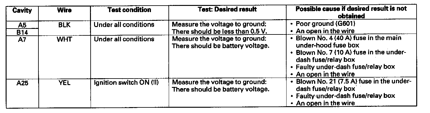 9. Reconnect the connectors, then turn the ignition switch ON (II), and make these input tests at the connectors.