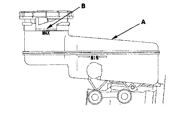 1. Make sure the brake fluid level in the reservoir (A) is at the MAX (upper) level line (B).