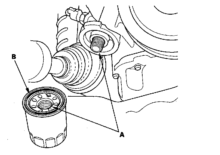 3. Inspect the threads (A) and rubber seal (B) on the new filter. Clean the seat on the engine block, then apply a light coat of new engine oil to the filter rubber seal. Use only filters with a built-in bypass system.