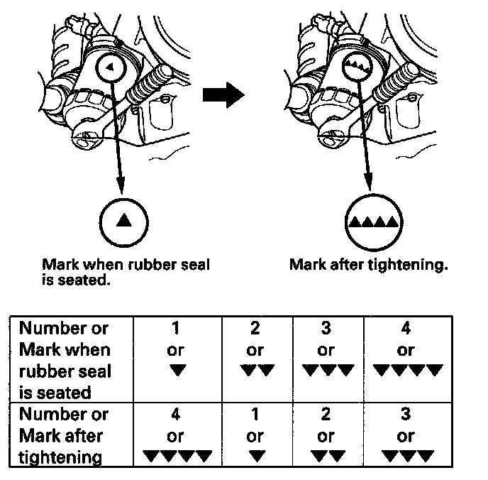 ^ Tighten the filter by turning it clockwise three numbers or marks from the one you noted. For example, if mark V is at the bottom when the seal is lightly seated, tighten the filter until the mark VVVV comes around to the bottom.