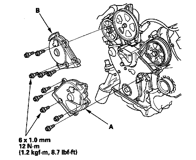 3. Set the timing belt drive pulley to top dead center (TDC) by aligning the TDC mark (A) on the tooth of the timing belt drive pulley with the pointer (B) on the oil pump.