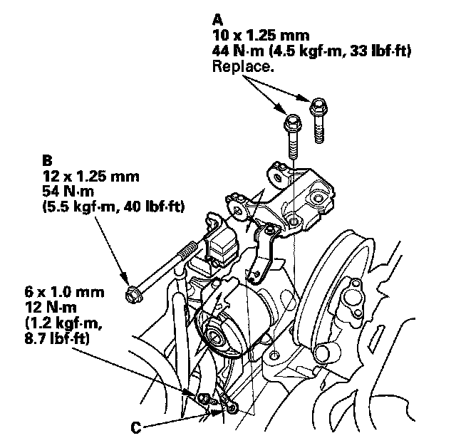 24. Install the upper half of the side engine mount bracket, and tighten the new mounting bolts (A), then tighten the mass damper mounting bolt (B).