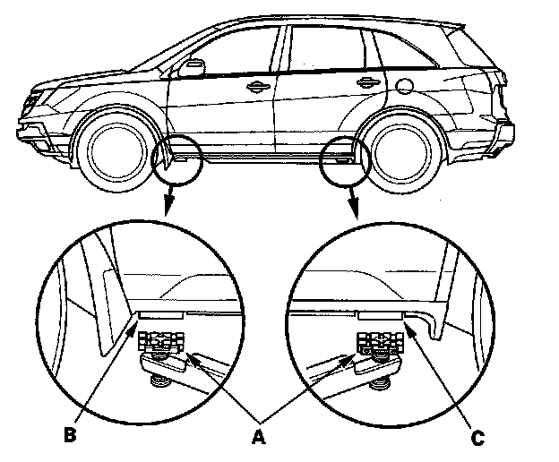 1. Position the lift blocks (A), under the vehicle's front support points (B) and rear support points (C).