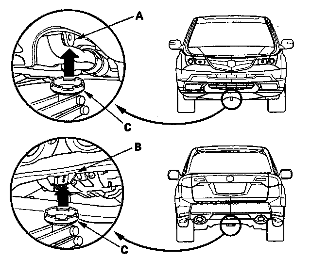 3. Position the floor jack under the front jacking bracket (A) or the rear jacking bracket (B). Center the jacking bracket on the jack lift platform (C) and jack up the vehicle high enough to fit the safety stands under it.
