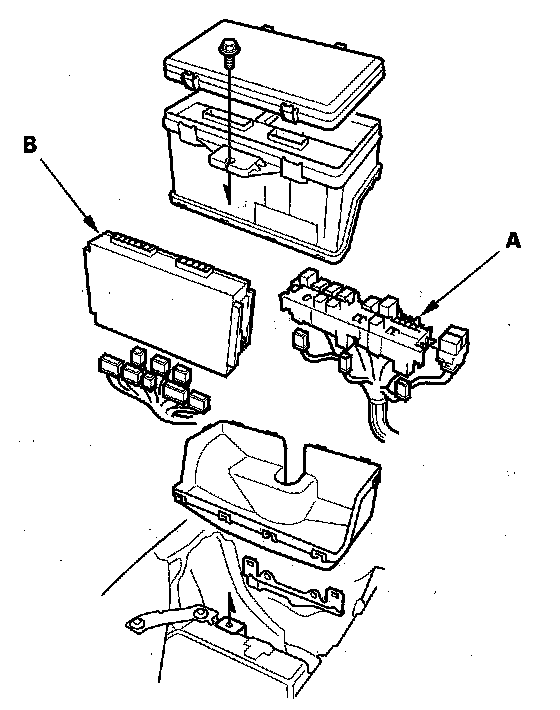 7. Remove the relay control module part (B) from the under-hood fuse/relay box, then disconnect the connectors from the relay control module.