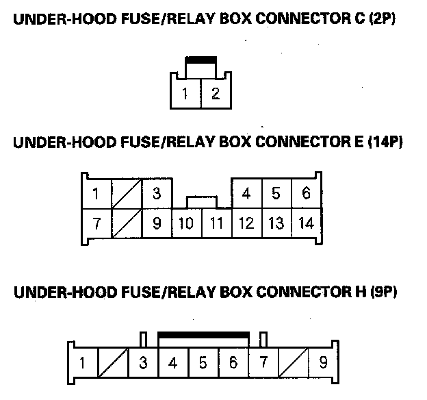 1. Disconnect the negative battery cable, then disconnect under-hood fuse/relay box connectors C (2P), E (14P), and H (9P).