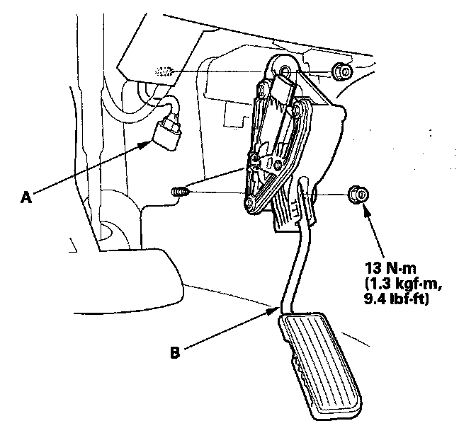 2. Remove the accelerator pedal module (B).