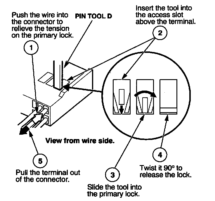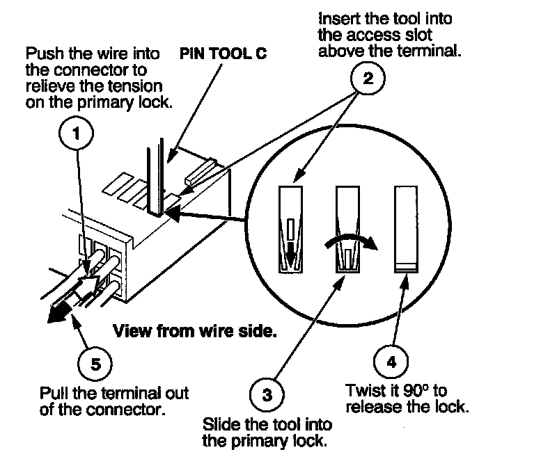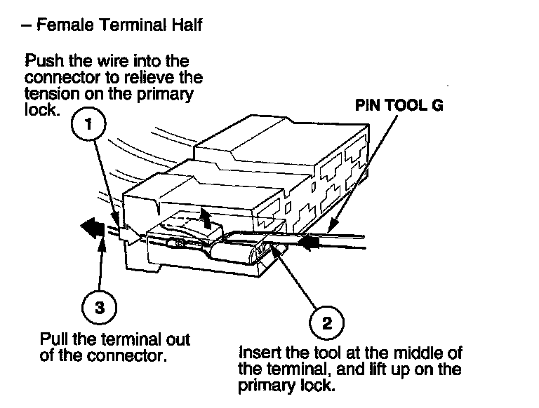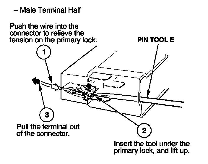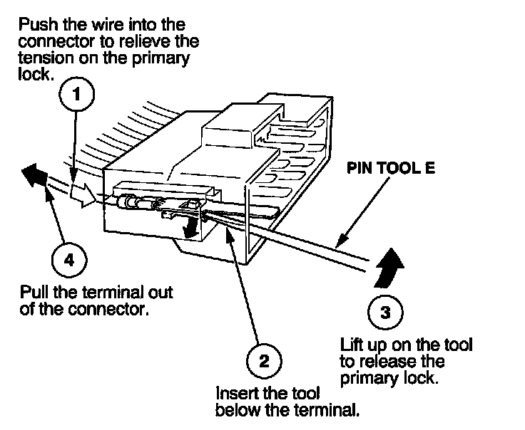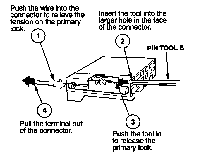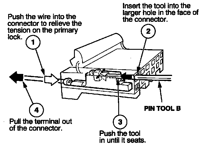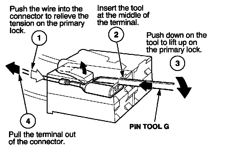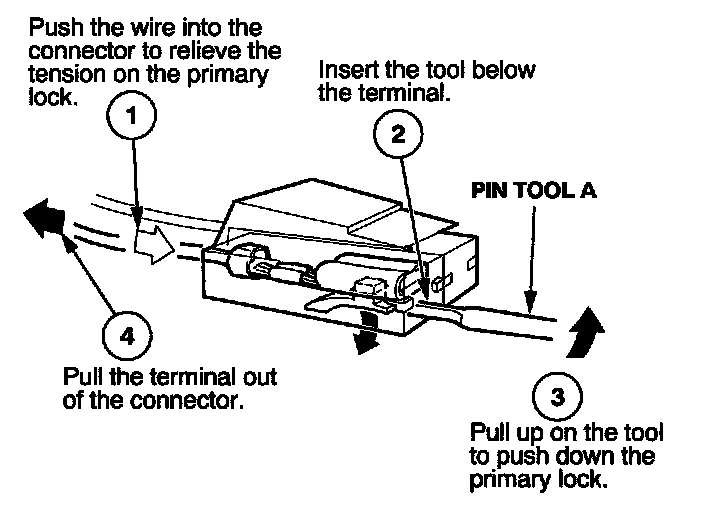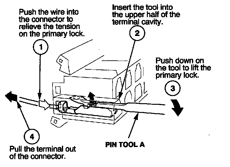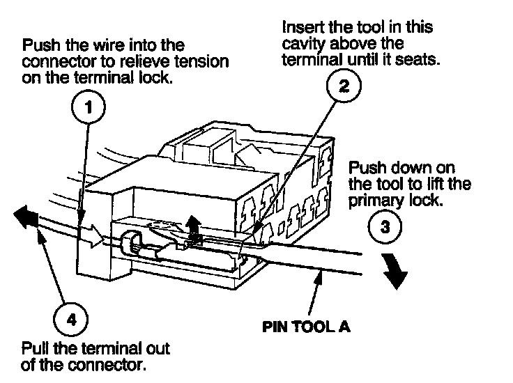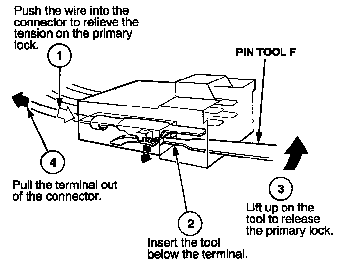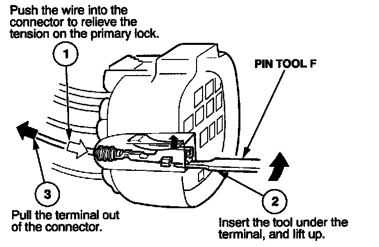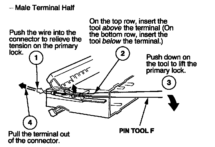 Before you begin, inspect the wire you are about to repair for damage and length. Make sure the wire will be long enough to make a terminal repair without stretching it when you reinstall the terminal in the connector. If the wire is too short, or if access to the connector is too restricted to make a terminal repair, you may need to install a pigtail terminal (a short length of wire with a factory-crimped terminal on it). Refer to HOW TO INSTALL PIGTAIL TERMINALS.
