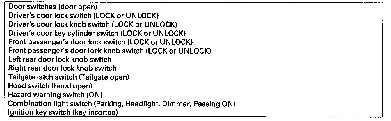 NOTE: If any control unit is faulty and will not wake up, several circuits in the system will malfunction at the same time. In the table below, the control unit is followed by a list of the switches and input signals that can wake it up.