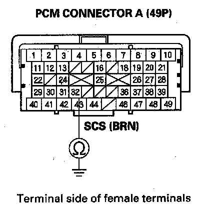 7. Check for continuity between PCM connector terminal A32 and body ground.