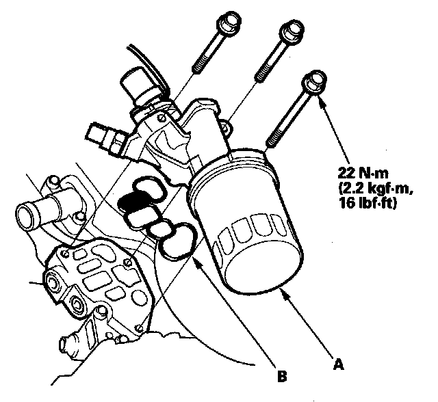 Rocker Arm Oil Control Solenoid Assembly Inspection1. Remove the rocker arm oil control solenoid/oil filter assembly (A) from the oil pump, and check the rocker arm oil control solenoid filter (B) for a restriction. If there is a restriction, replace the rocker arm oil control solenoid filter, the engine oil filter, and the engine oil.