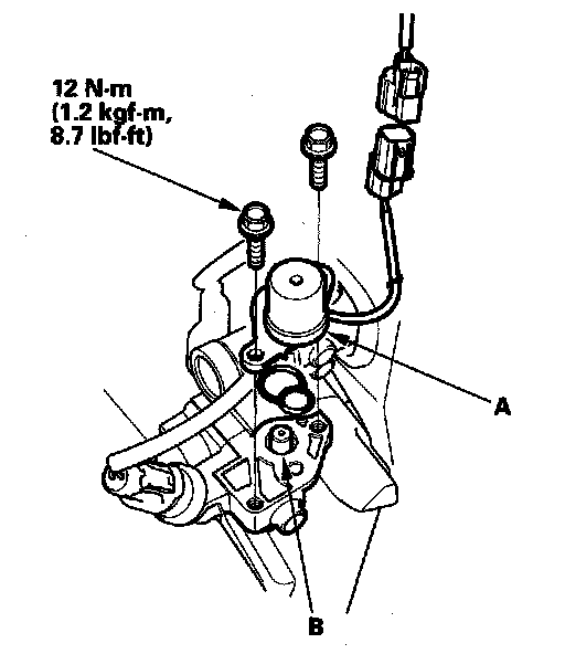 2. If the filter is not restricted, remove the rocker arm oil control solenoid (A), and push the valve (B) with your finger to check its movement. If the valve moves freely, it is normal; check the engine oil pressure. If the engine oil is OK, replace the rocker arm oil control solenoid. If the valve binds or sticks, replace the rocker arm oil control solenoid assembly.