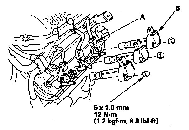 connector (A), then remove the ignition coils (B).