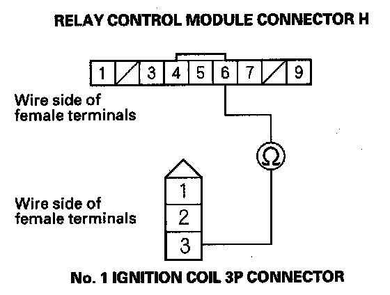 4. Check for continuity between the relay control module connector H terminal No. 6 and No. 1 ignition coil 3P connector terminal No. 3.