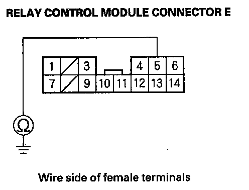 5. Check for continuity between the relay control module connector E terminal No. 5 and body ground.