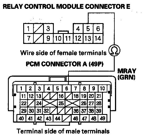 NO - Repair open in the wire between the relay control module connector E terminal No. 5 and the PCM (A6).