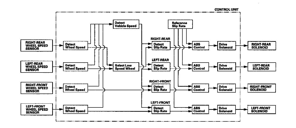 The control unit calculates the slip rate of each wheel, and transmits the control signal to the modulator unit solenoid valve when the slip rate is high.
