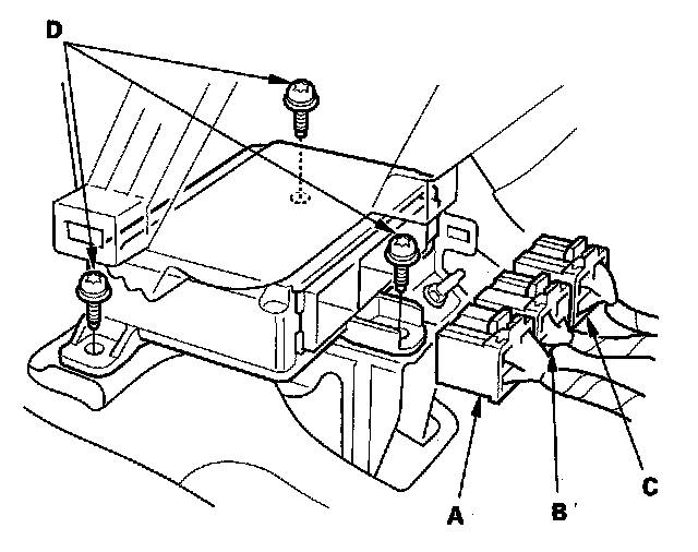 4. Disconnect SRS unit connector A, connector B, connector C, and remove the TORX bolts (D), then pull out the SRS unit.