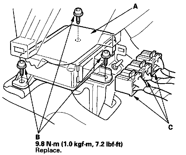 1. Install the new SRS unit (A) with new TORX bolts (B), then connect the connectors (C) to the SRS unit; push them into position until they click.