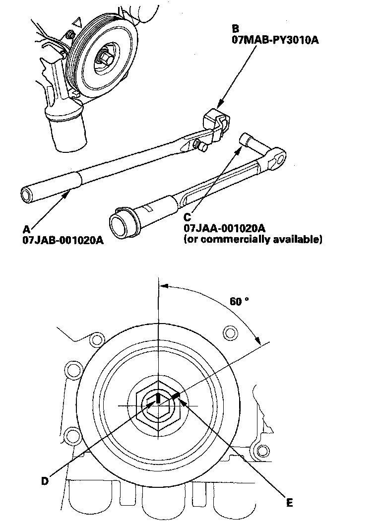 Mark the bolt head (D) and crankshaft pulley (E) as shown, then tighten the bolt an additional 60° (The mark on the bolt head lines up with the mark on the crankshaft pulley).