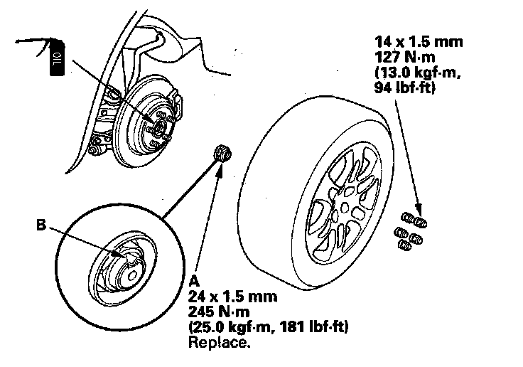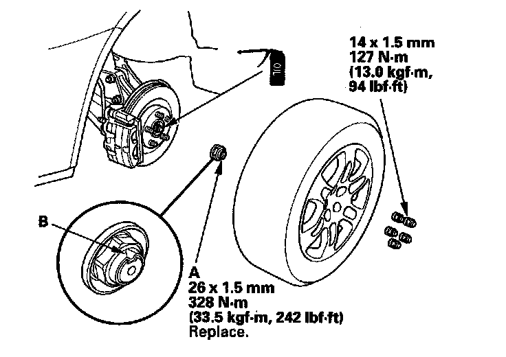 Install a new spindle nut, then tighten the nut. After tightening, use a drift to stake the spindle nut shoulder (B) against the driveshaft.
